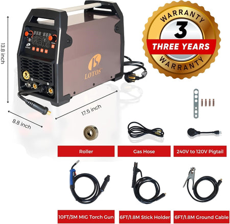 - ★ Complete setup kit included: Comes with MIG torch, stick holder, ground clamp, contact tips, rollers, gas hose, 240V to 120V adapter, and NEMA 6-50 plug.