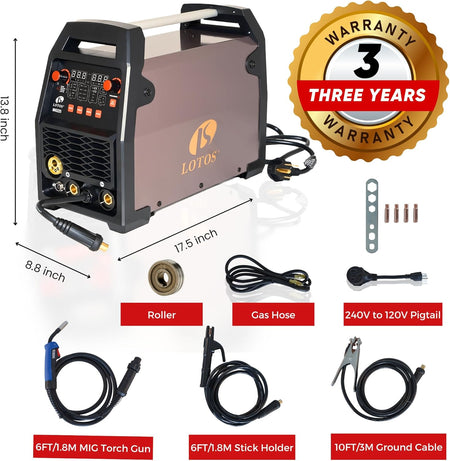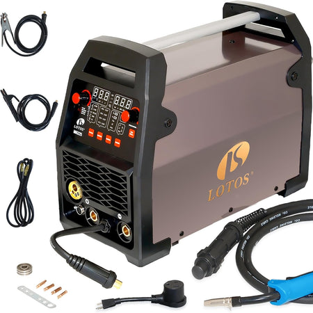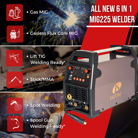 LOTOS MIG225 225A MIG Welder, 6 in 1 Gas MIG, Gasless Flux Core MIG, Stick, Lift TIG, Spot, Spool Aluminum Multi Process Welding Machine, Auto MIG Synergistic Setting & Voltage Fine Tuning, 120/240V