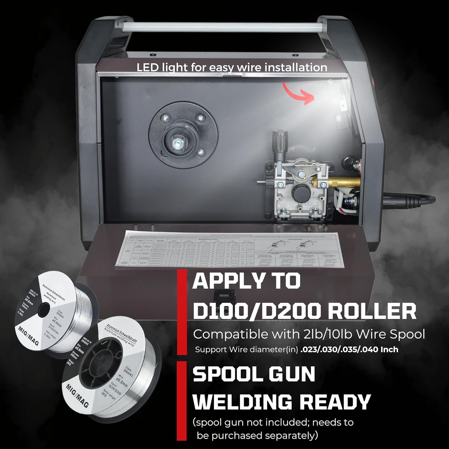 โ 6-iN-1 Multi-Process Welder:ย This versatile welding machine supports multiple processes, including Gas/Solid Wire MIG (GMAW), Gasless Flux Core MIG (FCAW), Stick/MMA, Spot Welding, and Lift TIG. It also has an optional spool gun connector(๐๐๐ ๐ ๐ฎ๐ง ๐๐ง๐ ๐ฌ๐ฉ๐จ๐จ๐ฅ ๐ ๐ฎ๐ง ๐ง๐จ๐ญ ๐ข๐ง๐๐ฅ๐ฎ๐๐๐). Itโs suitable for a variety of welding needs, compatible with .023โ/.030โ/.035โ/.040โ solid wire, flux core wire, and aluminum wire.